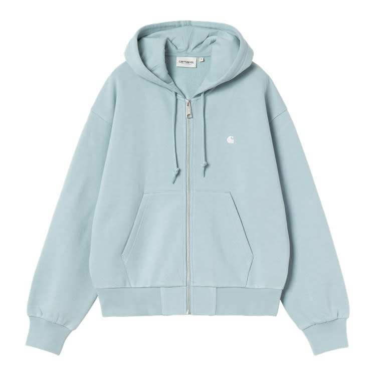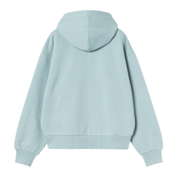 De Carhartt WIP W' Hooded Casey Jacket Tourmaline / Silver is een stijlvolle en comfortabele dames hooded jacket met een moderne urban look en klassieke workwear‑inspiratie. Het item is gemaakt van heavy cotton jersey met een zachte, brushed binnenkant waardoor het extra warmte en comfort biedt. De balloon fit zorgt voor een iets losser, boxy silhouet met dropped shoulders en ribgebreide boorden, wat bijdraagt aan een casual, ontspannen stijl. De verstelbare capuchon en kangoeroezak maken deze hoodie‑jas ook functioneel voor dagelijks gebruik. Het subtiel geborduurde ‘C’ logo op de borst geeft een herkenbare Carhartt WIP touch.