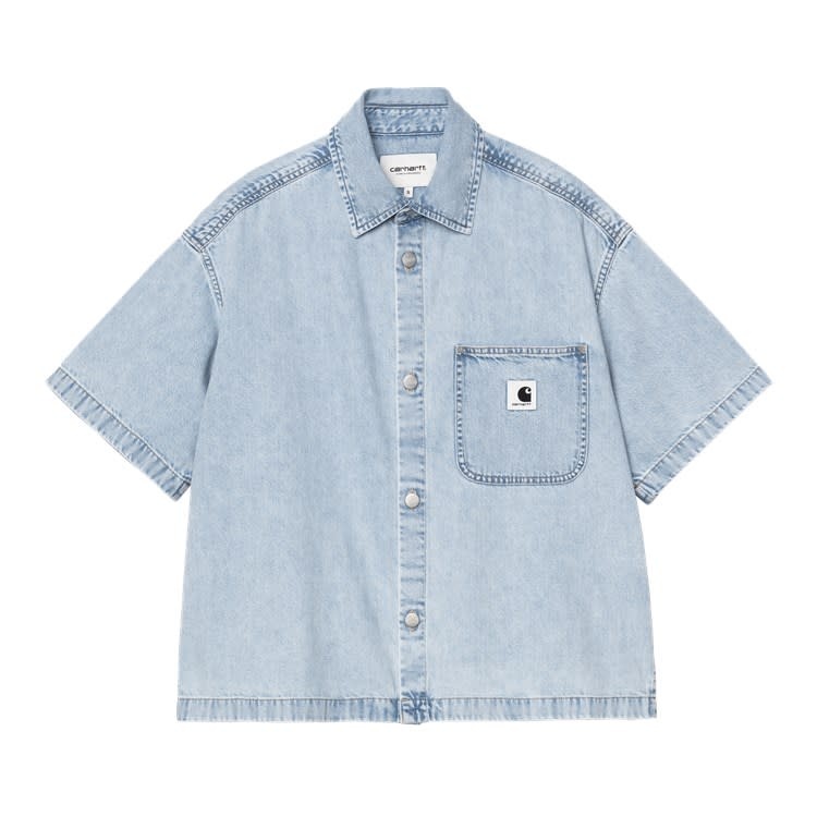 De Carhartt WIP W' S/S Lovilia Shirt Blue Stone Washed is een denim damesblouse met korte mouwen en een casual, relaxed fit die perfect past binnen de workwear‑geïnspireerde stijl waar Carhartt WIP om bekend staat. Gemaakt van 100% stevig katoen denim heeft dit shirt een lichte washed look die draagt bij aan een vintage uitstraling zonder in te leveren op kwaliteit of comfort. De klassieke kraag en de knoopsluiting geven structuur aan het ontwerp, terwijl de borstzak met Carhartt Square label een subtiel merkaccent biedt.